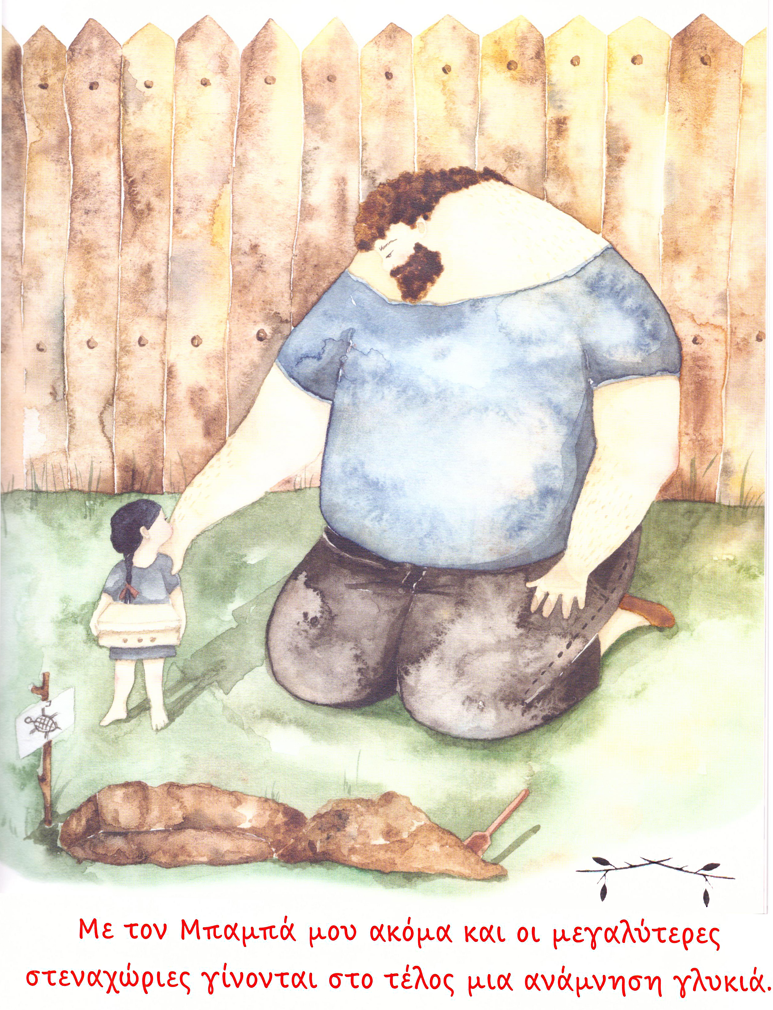 Τον έκανα μεγάλο, πολύ μεγαλύτερο από τη φιγούρα του μικρού κοριτσιού, γιατί έτσι τον βλέπει εκείνη. Άλλωστε πολλοί από εμάς βλέπουμε με τον ίδιο τρόπο τους ήρωες ή τους γονείς μας (οι οποίοι, αν είμαστε τυχεροί, ταυτίζονται). Η γενειάδα του μου θυμίζει κάτι πολύ παλιό, δυνατό, στέρεο. Είναι εκείνος που βρίσκεται κοντά σου επειδή σε αγαπάει έτσι απλά, άνευ όρων και για πάντα. Εύχομαι και ο γιος μου να γίνει ο ήρωας για τα δικά του παιδιά κάποια μέρα.